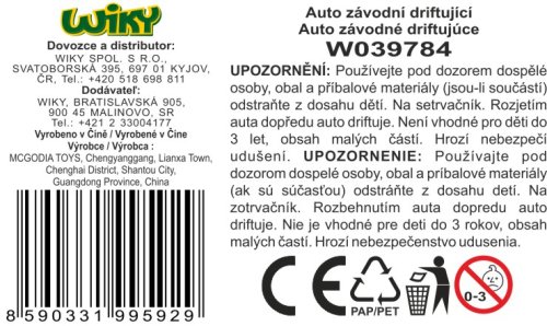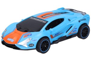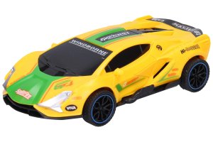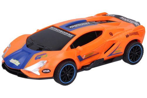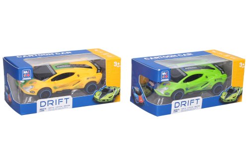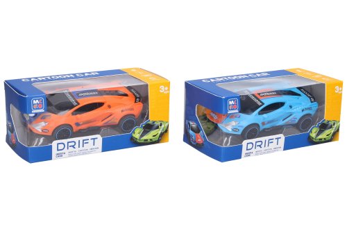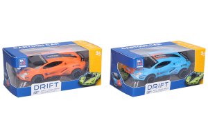 Auto závodné driftujúce. Rozmery 15,5x8x4 cm. Rozbehnutím auta dopredu samo driftuje (šmykuje) - uprostred podvozku je kolmé koliesko. Na zotrvačník. 4 varianty - modré, zelené, oranžové, žlté.
