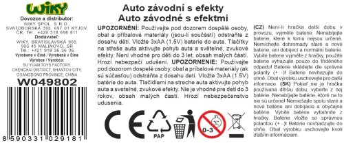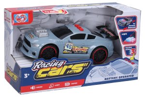 Auto závodné s efektmi. Veľkosť 21 cm. Vydáva svetelné a zvukové efekty. Aktivácia tlačidlami na streche. Ľavé tlačidlo - zvuk motora, pohyb dopredu a po krátkej pauze pohyb dozadu. Prostredné tlačidlo - zvuk trúbenia. Pravé tlačidlo - hudba. Batérie 3xAA (1,5V), nie sú súčasťou.