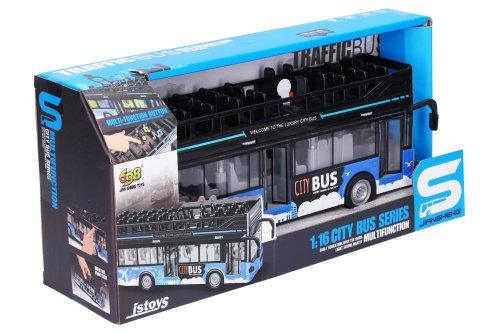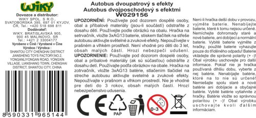 Autobus dvojposchodový vyhliadkový s efektmi. Rozmery 28,5x6,5x12 cm. Na zotrvačník. Svetelné a zvukové efekty tlačidlami na streche. 3xAG13 batérie súčasťou. Otváracie dvere kolieskami nad oknami.