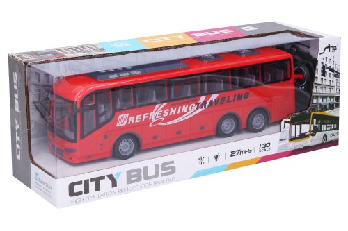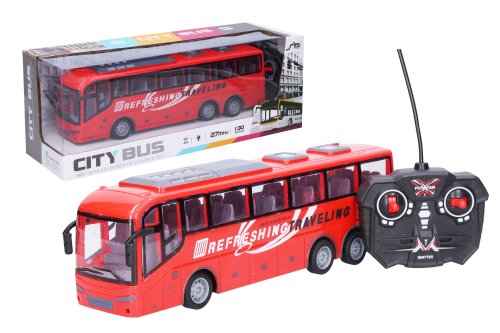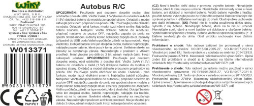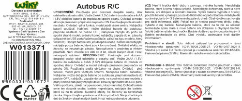 Autobus RC na diaľkové ovládanie. Veľkosť 32 cm. Frekvencia 27MHz. Svetelné efekty. Nabíjací 4xAA batérie do autobusu a nabíjací adaptér súčasťou, 2xAA do ovládača nie sú súčasťou.