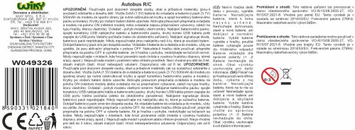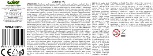 Autobus RC na diaľkové ovládanie. Rozmery 38x8x8 cm. Frekvencia 2.4GHz. Svetelné efekty. Batériový pack 3.7V Li-ION 500mAh do autobusu súčasťou, 2xAA do ovládača nie sú súčasťou. USB kábel súčasťou. Prepínač ON/OFF na spodnej strane autobusu a na ovládači.