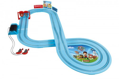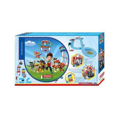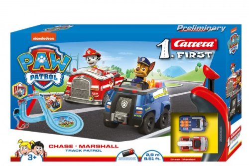 Autodráha Carrera FIRST dlhá 2,9 ms autami zo seriálu Paw Patrol, obsahuje rovinky, zúženie dráhy pre možné zrážky, zákruty, točiacu bránu, ovládače a dekorácie s tématikou Paw Patrol, na batérie. Rozmer krabice: 114 x 88 cm Vhodné od 4 rokov