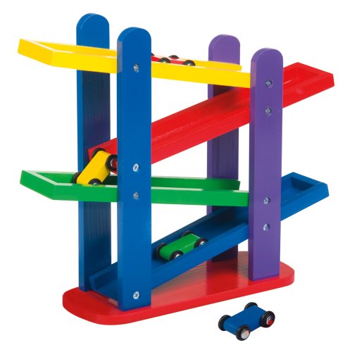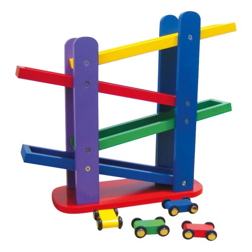 Drevená autodráha so štyrmi farebnými autíčkami, ktoré vďaka preklopeniu ľahko zdolávajú kaskádu farebných cestičiek. Postavte autíčko na najvyššiu časť autodráhy a sledujte čo urobí! Zábavná hračka nielen pre chlapcov, ktorú si deti zamilujú.