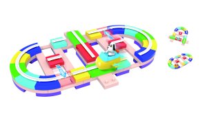 Autodráha stavebnice s vozíkom a figúrkou psíka. Rozmery 59x36 cm, dĺžka trate 118 cm. Obsahuje 82 dielikov a obrázkový návod. Vozík má 2 rýchlostné režimy, ktoré sa volia prepínačom v zadnej časti vozíka. Dráha má niekoľko pohyblivých dielikov. Manuálnou manipuláciou s týmito dielikmi je možné počas chodu meniť dráhu jazdy. Vozík - 2xAAA batérie nie sú súčasťou. Pre lepšiu stabilitu je možné na spodnú stranu dráhy umiestniť prísavky (balenie obsahuje 10 ks).