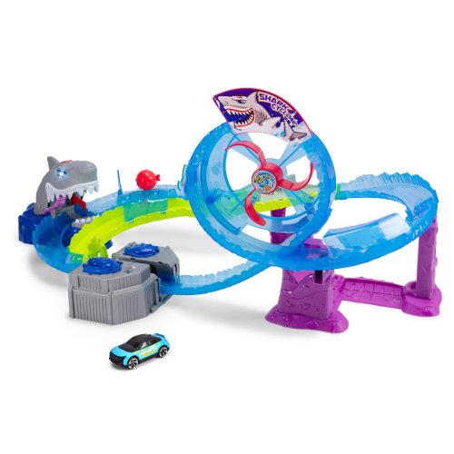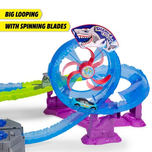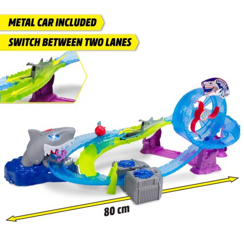 Autodráha White Shark s dĺžkou 80 cm. Motorizovaná žraločia dráha so slučkou. Svetelná aj zvuková funkcia - hrozivé podvodné zvuky, svetelné efekty a žraločí rev. Autá sa plnou rýchlosťou rútia slučkou, prechádzajú vodný tunel alebo pristávajú priamo u veľkého bieleho žraloka - ale pozor, môže kedykoľvek skúsnuť čeľuste. Turbo booster privádza vozidlá na najvyššiu rýchlosť. Súčasťou je kovové autíčko. Rozmery autodráhy: 50 x 55 x 32 cm.