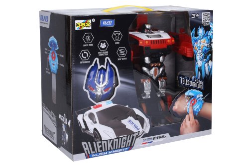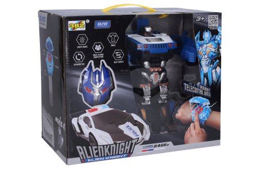Autorobot RC na diaľkové ovládanie na ruku. Ovládač v podobe hodiniek na ruku. Rozmery 22x10x8,5 cm. Frekvencia 2.4GHz. Svetelné a zvukové efekty. 3xAA batérie do auta nie sú súčasťou, 3xAG13 do ovládača sú súčasťou. Ovládač - tlačidlový kríž - pohyb auta všetkými smermi, prostredné tlačidlo - transformácia v robota, ľavé bočné tlačidlo - odklopenie krytu ovládacích hodiniek. 2 varianty - červená, modrá.