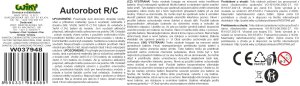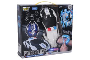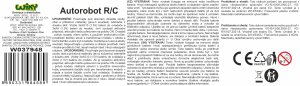 Autorobot RC na diaľkové ovládanie na ruku. Ovládač v podobe hodiniek na ruku. Rozmery 24x10x8 cm. Frekvencia 2.4GHz. Svetelné a zvukové efekty. 3xAA batérie do auta nie sú súčasťou, 3xAG13 do ovládača sú súčasťou. Ovládač - tlačidlový kríž - pohyb auta všetkými smermi, prostredné tlačidlo - transformácia v robota, ľavé bočné tlačidlo - odklopenie krytu ovládacích hodiniek.