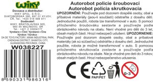 Autorobot policajné skrutkovacie. Rozmery 15x6,7x6,5 cm. Voľné kolesá. Obrázkový návod na zostavenie na spodnej strane obalu. Obsahuje - auto, skrutkovač.