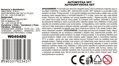 Auto meniaci farbu podľa teploty set s umývačkou 35 cm. Rozmery umývačky 35x16x24 cm. Auto 8 cm, voľné kolesá. Auto mení farbu v závislosti na teplote. Umyte studenou vodou alebo teplou vodou (viac ako 37°C). Nasajte do nádržky vodu (nádržka je mäkká, stlačením a uvoľnením nasajete vodu). Nádržku umiestnite na umývačku a stlačte. Obrázkový návod na zostavenie na obale.
