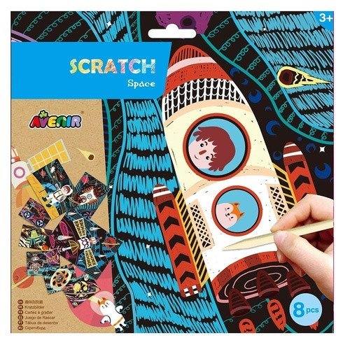 Kreatívna zábava pre deti, to sú škrabacie obrázky. Nechajte chlapcov aj dievčatá vziať do ruky drevené vyškrabávacie pero a sledujte, ako sa z čiernej plochy rodí krásny farebný obrázok. Deti tak rozvinú svoju jemnú motoriku a kreativitu. Vyškrabávacie pero je prispôsobené deťom a škriabe iba jemne. V sade Avenir deti nájdu osem obrázkov.