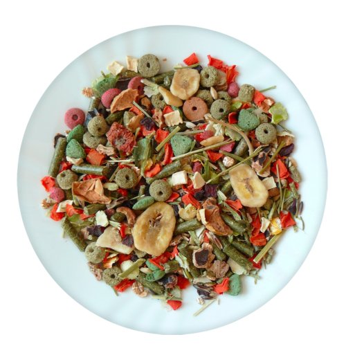 Zloženie: Lucerna, zelenina (mrkva, červená repa, paštrnák, petržlen), extrudovaná kukuričná múka, extrudovaná pšeničná múka, seno, hrachové vločky, svätojánsky chlieb, ovocie (jablká, banány), extrudovaná hrachová múka, jablko.