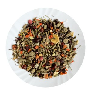 Zloženie: Lucerna, ovocie (šípky, jarabiny, jablká, hrozienka, banán), hrachové vločky, extrudovaná kukuričná múka, extrudovaná pšeničná múka, svätojánsky chlieb, zelenina (mrkva, petržlen), extrudovaná hrachová múka, jablko.