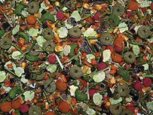 zloženie: zelenina (mrkva, červená repa, pastyniak, petržlen), lucerna, hrachové vločky, pšenica, kukurica, svätojánsky chlieb, pšeničné vločky, ovos, nechtík.