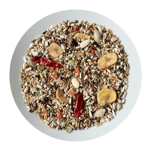 Zloženie: Svetlice farbiarska, ovos nahý, pohánka, slnečnica biela, cirok biely, lesknica, paddy ryža, cirok červený, proso žlté, proso biele, ovos celý, proso červené, hrachové vločky, sušené banány, pšenica, konopné semeno, mariánsky tekvica, sušená mrkva, jačmeň, chilli papričky.