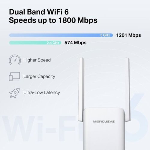 AX1800 Wi-Fi Range Extender SPEED: 574 Mbps at 2.4 GHz + 1201 Mbps at 5 GHz SPEC: 2× Fixed External Antennas, 1× Gigab