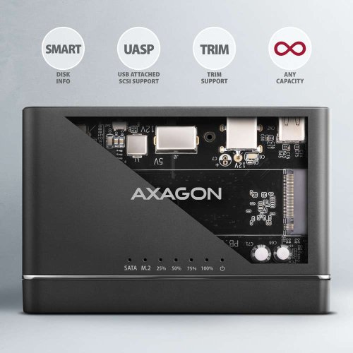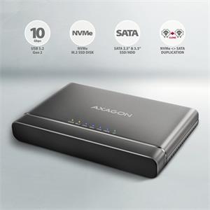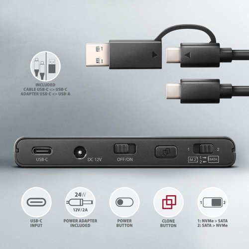 USB 3.2 Gen 2 adaptér pre pripojenie NVMe M.2 SSD a SATA 2.5 "/3.5" diskov s funkciou klonovania.