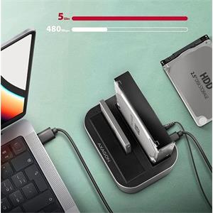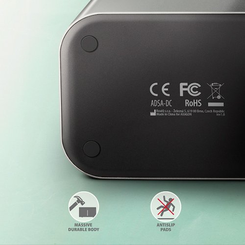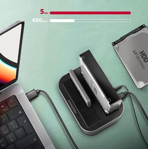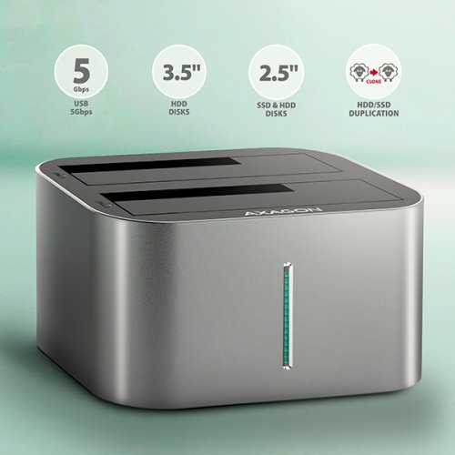 SuperSpeed USB-C 5Gbps dokovacia / klonovacia stanica AXAGON ADSA-DC DUAL CLONE pripojí k počítaču ľahko a rýchlo až dva 2.5" alebo 3.5" disky súčasne. Pripojenie k počítaču umožňuje moderný obojstranný USB-C konektor na doku spolu s dodávaným káblom USB-C --- USB-A s dĺžkou 80 cm.