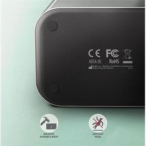 Skriňa stanice je dostatočne robustná a odolná, čo umožňuje dokonalú stabilitu aj s vloženými diskami. Gumové nôžky obmedzujú posúvanie po stole a vibrácie pevných diskov. Vonkajší plášť je zhotovený z hliníka s elegantným brúseným povrchom.