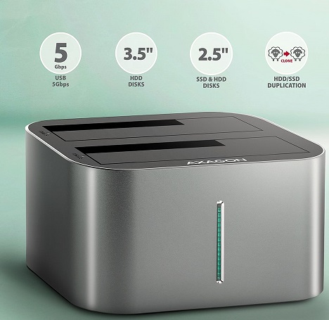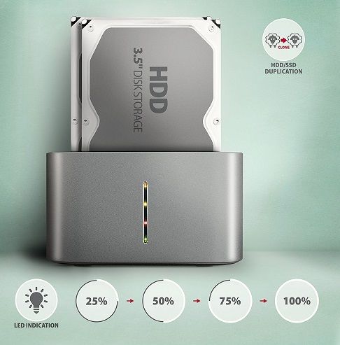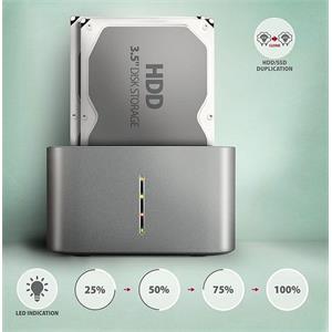 Dokovaciu stanicu tiež využijete na jednoduché klonovanie obsahu pripojených diskov bez potreby pripojenia k PC. Do prvého slotu stanice HDD A (source) zasuniete zdrojový disk a do druhého slotu HDD B (target) zasuniete cieľový disk. Potom len stlačíte klonovacie tlačidlo a sledujete priebeh klonovania na stupnici štyroch LED diód. Po skopírovaní všetkých dát je na cieľovom disku presná kópia pôvodného disku. Dock tak možno využiť ako autonómne zariadenie na pohodlné duplikovanie a vytváranie obrazov diskov. Ide o najjednoduchší spôsob, ako preniesť obsah napríklad starého HDD disku na nový SSD disk, a to vrátane funkčného operačného systému (Windows, macOS, Linux...).