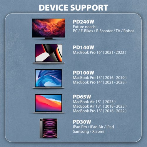 • Vhodný pre počítače, notebooky, mobilné telefóny, tablety, powerbanky, elektrické náradie a ďalšie zariadenia s USB-C konektorom.