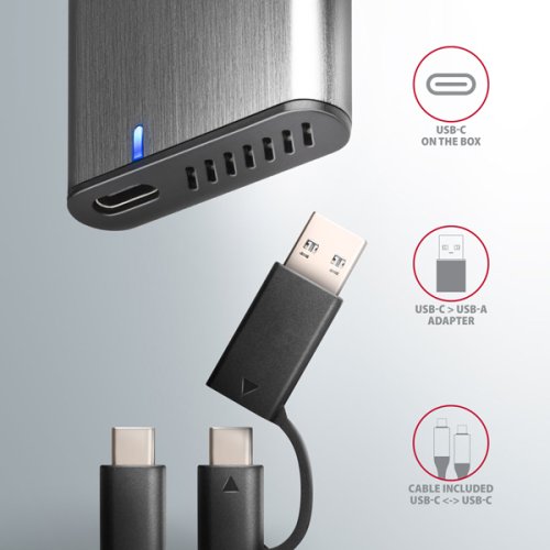 Univerzálny externý AXAGON EEM2-SG2 RAW box s USB 3.2 Gen 2 rozhraním určený pre M.2 NVMe alebo SATA SSD disky. Spoľahlivé pripojenie umožňuje obojstranný USB-C konektor na boxe. V balení nájdete nielen kábel USB-C - USB-C pre pripojenie boxu k počítaču, ale aj USB-C - USB-A redukciu. Môžete tak box pripojiť k akémukoľvek voľnému USB portu na notebooku.