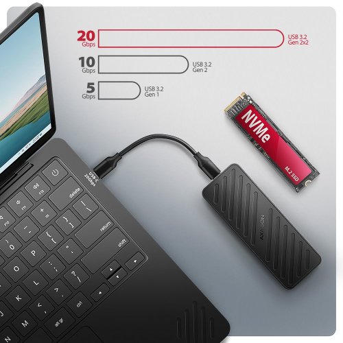 AXAGON EEM2-20G; Rýchly externý box pre pripojenie M.2 NVMe SSD disku (bez obmedzenia kapacity) pomocou konektora USB-C, cez ktorý je zároveň aj napájaný.