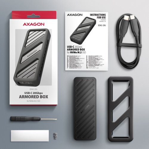 Rýchly externý AXAGON EEM2-20G ARMORED box s USB 20Gbps rozhraním určený pre M.2 NVMe SSD disky. Spoľahlivé pripojenie umožňuje obojstranný USB-C konektor na boxe. V balení nájdete kábel USB-C -- USB-C pre pripojenie boxu k počítaču.