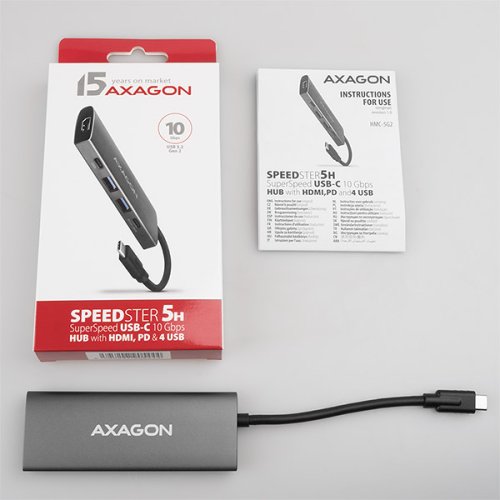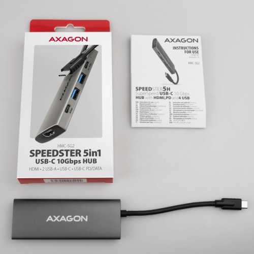 Multiportový USB-C 10Gbps AXAGON HMC-5G2 SPEEDSTER 5in1 húb rozšíri Váš notebook, počítač alebo telefón o päticu portov . Cez obojstranný USB-C konektor ľahko a rýchlo pripojíte k počítaču monitor a tri USB zariadenia súčasne. Zároveň získate možnosť napájania notebooku pomocou technológie Power Delivery . Replikátor portov vám tak poskytne jednoduchú a skladnú dokovaciu stanicu 5v1 nielen k Windows notebookom ale aj Apple notebookom ako je napríklad MacBook Air alebo MacBook Pro. USB rozbočovač ponúka celkom štyri USB výstupy s rýchlosťou 10Gbps - dva so štandardnými USB-A konektormi a dva s USB-C . Vďaka pokročilému štandardu USB 3.2 Gen 2 môžete ku všetkým výstupom pripojiť vysokorýchlostné zariadenia ako NVMe M.2 externé disky až 2x vyššou rýchlosťou 10 Gb/s oproti štandardným hubám Gen 1 s rýchlosťou iba 5 Gb/s. Multiportový hub zvládne trvalé pripojenie niekoľkých externých diskov súčasne a tiež dovolí nabíjanie notebookov, telefónov a tabletov prúdom až 3A . Z hubu tak ľahko nabijete napr. Android smartfón, Apple iPhone, Apple iPad a pod. Jeden z USB-C portov je kombinovaný a môže byť použitý buď na prenos dát, alebo na nabíjanie telefónov a notebookov pomocou technológie Power Delivery 3.0 výkonom až 100W . Do hubu zapojíte vhodnú USB-C Power Delivery nabíjačku a húb pripojíte k notebooku s podporou Power Delivery. Tým tiež uvoľníte jeden USB-C port. HDMI výstup poskytuje kvalitný obraz až do rozlíšenia 4K/60Hz Ultra HD a podporuje prenos viackanálového zvuku. Podporované sú tiež vysoké frekvencie v obľúbených hráčskych rozlíšeniach 2K/120Hz alebo FullHD/120Hz . Vďaka podpore HDR (vysoký dynamický rozsah) si môžete bez obmedzenia vychutnať výrazne rozšírený rozsah farieb a kontrastov. Pre správne fungovanie video výstupu je nutné, aby notebook mal USB-C port s podporou DisplayPort Alternate Mode (DP Alt Mode) alebo port Thunderbolt 3, 4 a vyššie. Kompaktné a štíhle hliníkové telo nielen skvele vyzerá, ale zaistí aj mechanickú odolnosť a pasívne chladenie . Poteší tiež jemne štruktúrovaný povrch, na ktorom nezostávajú odtlačky prstov. USB-C hub je ideálnym doplnkom pre notebooky bez USB-A konektorov a video výstupu . Možno tak využiť Vaše existujúce USB periférie bez nutnosti zaobstarávania nových. Vďaka funkciám Plug and Play a Hot Plug je samotné zapojenie hubu veľmi jednoduché bez zložitej inštalácie, a taktiež je možné jednoducho pripájať a odpájať periférie za behu počítača. Rozbočovač sa nezľakne ani pripojenie k telefónom s USB-C konektorom. K telefónu tak pripojíte napríklad flash disk, klávesnicu, myš, monitor, TV alebo projektor.
