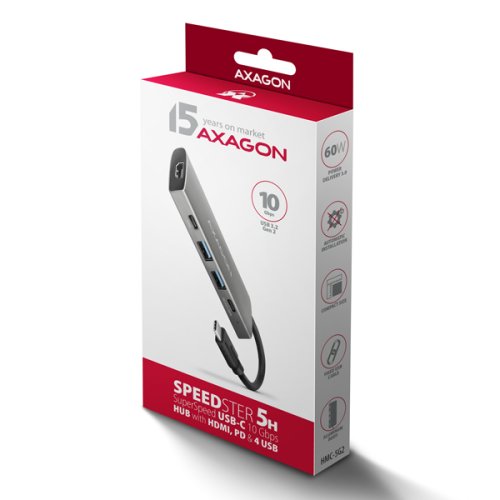 Multiportový USB-C 10Gbps AXAGON HMC-5G21 SPEEDSTER 5in1 húb rozšíri váš notebook, počítač alebo telefón o päticu portov . Pripojenie k zariadeniu prebieha prostredníctvom 13 cm USB-C kábla. Okamžite tak máte k dispozícii pripojenie pre 4K monitor a ďalšie USB periférie . Zároveň získate možnosť napájania notebooku pomocou technológie Power Delivery . Kompatibilita s Thunderbolt 3/4/5 vám tiež poskytne jednoduchú a skladnú dokovaciu stanicu k notebooku ako je napríklad Apple MacBook Air alebo Pro . Dva USB-A 10Gbps výstupy umožňujú pripojenie externých diskov, flash disku, myši, tlačiarne a ďalšieho USB príslušenstva. USB porty taktiež nabíja mobilné telefóny a tablety prúdom až 1.5A. Hub je tiež vybavený kombinovaným USB-C portom , ktorý môže byť použitý na prenos dát (USB 10Gbps), alebo na nabíjanie notebooku pomocou Power Delivery nabíjačky. S využitím vhodnej PD nabíjačky tak napájate nielen notebook, ale aj samotný húb, s výkonom až 60W vďaka technológii Power Delivery 3.0 . HDMI výstup umožňuje pripojenie externého monitora, TV alebo projektora s rozlíšením až 4K/30Hz Ultra HD, 2K/60Hz Quad HD alebo 1080p/120Hz Full HD a prenos viackanálového zvuku. Pre správne fungovanie video výstupu je nutné, aby notebook mal USB-C port s podporou DisplayPort Alternate Mode (DP Alt Mode) alebo port Thunderbolt 3 a vyššie. Kompaktné a štíhle hliníkové telo nielen skvele vyzerá, ale zaistí aj mechanickú odolnosť a pasívne chladenie . Poteší tiež jemne štruktúrovaný povrch, na ktorom nezostávajú odtlačky prstov. USB-C hub je ideálnym doplnkom pre notebooky bez USB-A konektorov a video výstupu . Možno tak využiť Vaše existujúce USB periférie bez nutnosti zaobstarávania nových. Vďaka funkciám Plug and Play a Hot Plug je samotné zapojenie hubu veľmi jednoduché bez zložitej inštalácie, a taktiež je možné jednoducho pripájať a odpájať periférie za behu počítača. Rozbočovač sa nezľakne ani pripojenie k telefónom s USB-C konektorom. K telefónu tak pripojíte napríklad flash disk, klávesnicu, myš, monitor, TV alebo projektor.