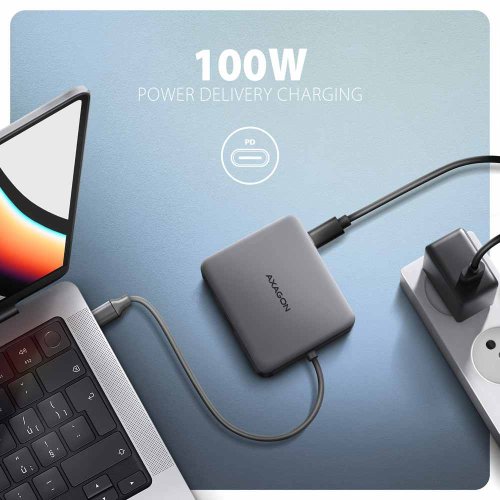 USB-C konektor je vyhradený iba pre napájanie a súčasné dobíjanie notebookov pomocou technológie Power Delivery 3.0 výkonom až 100W. Do hubu zapojíte USB-C Power Delivery nabíjačku a húb pripojíte k notebooku. Tým tiež uvoľníte jeden USB-C port. Podmienkou je notebook s podporou nabíjania z USB-C portu pomocou Power Delivery a vhodná PD nabíjačka.