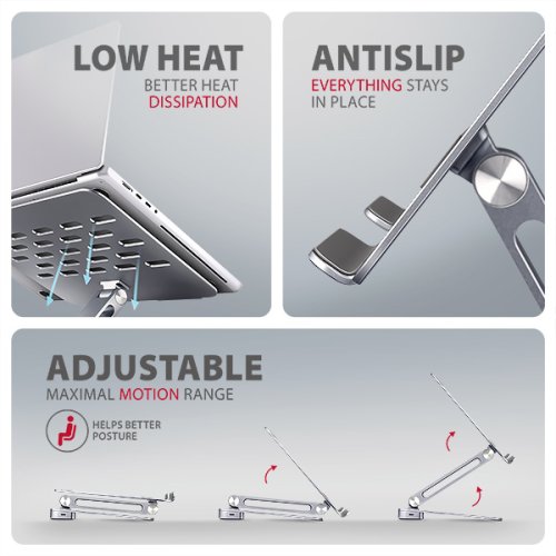 Vlastnosti stojana: • Ľahká a pevná kovová konštrukcia. • Protišmyková úprava, ktorá zároveň chráni zariadenie od poškriabania. • Vhodný pre 10" - 16" notebooky, alebo iné zariadenia. • Nastaviteľná výška až 205 mm. • Mnoho nastaviteľných polôh • Nastavenie sklonu podstavca (180 ° - 90 °) • Nastavenie sklonu ramena (180 ° - 90 °) • Skladný a ľahko zložiteľný. • Lepší odvod tepla z notebooku.