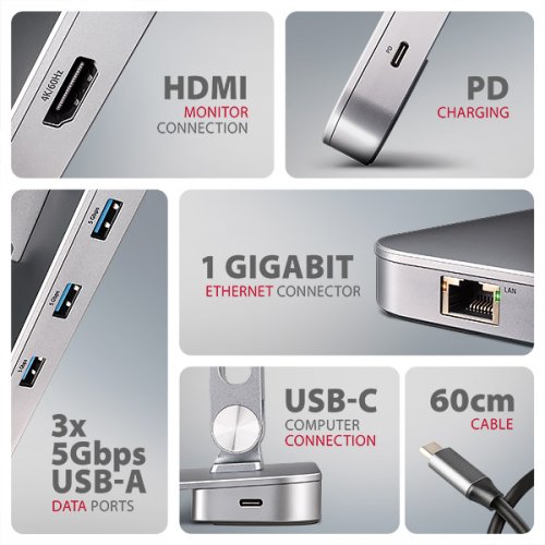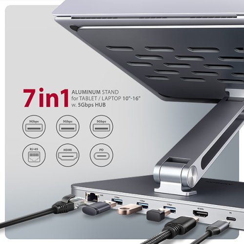 AXAGON HMC-STND 7in1 Hub & Stand je jedinečný multifunkčný húb integrovaný do stojana pre notebook alebo tablet. Tento húb rozšíri Váš notebook alebo tablet o ďalších šesť portov . Váš notebook pripojíte k hubu cez USB-C <-> USB-C kábel dlhý 60 cm. Okamžite tak máte k dispozícii pripojenie pre monitor , tri USB zariadenia , konektor RJ-45 pre Gigabitovú ethernet sieť a napájanie notebooku pomocou technológie Power Delivery . Stojan s dvoma kĺbmi zlepšuje ergonómiu a pohodlie pri práci a je vhodný pre zariadenia od 10" do 16" . Je ideálna ako dokovacia stanica 7v1 pre Windows notebooky aj Apple MacBook Air alebo MacBook Pro . Tri USB-A 5Gbps výstupy umožňujú pripojenie externých diskov (až 2 súčasne), flash disku, myši, tlačiarne a ďalšieho USB príslušenstva. USB porty taktiež nabíja mobilné telefóny a tablety výkonom až 7.5W. Gigabitová sieťová karta rozšíri počítač o rýchle a stabilné sieťové pripojenie, doplní chýbajúci sieťový RJ-45 Ethernet konektor, alebo pridá ďalšiu sieťovú kartu. HDMI výstup umožňuje pripojenie externého monitora, TV alebo projektora s rozlíšením až 4K/60Hz Ultra HD, 2K/120Hz Quad HD alebo 1080p/200Hz Full HD a prenos viackanálového zvuku. Vďaka podpore HDR si môžete vychutnať výrazne rozšírený rozsah farieb a kontrastov bez obmedzenia. PD USB-C vstup je určený pre vhodnú Power Delivery nabíjačku. Vďaka tomu je vaše mobilné zariadenie aj húb napájaný priamo z PD nabíjačky s využitím technológie Power Delivery 3.0 s výkonom až do 100W . Druhý USB-C konektor slúži na prepojenie s notebookom pomocou priloženého 60 cm dlhého kábla s obojstranným USB-C konektorom na oboch koncoch. Vďaka funkciám Plug and Play a Hot Plug je samotné zapojenie hubu veľmi jednoduché bez zložitej inštalácie, a taktiež je možné jednoducho pripájať a odpájať periférie za behu počítača. Veľkou výhodou stojana je chytré riešenie s dvojitým kĺbom , ktoré umožňuje nastaviť uhol náklonu aj výšku obrazovky notebooku tak, aby bola v jednej rovine s externým monitorom. Tým získate ďalšiu pracovnú plochu v správnej úrovni očí, čo výrazne zlepšuje ergonómiu, zvyšuje pohodlie pri práci a podporuje vašu produktivitu. Elegantný dizajn tohto stojana nielen štýlovo doplní váš pracovný stôl, ale zároveň ponúka praktické funkcie. Podstavec aj kryt hubu sú vyrobené z robustných hliníkových odliatkov , ktoré zaisťujú pasívne chladenie a garantujú dlhú životnosť a spoľahlivosť stojana aj hubu. Výrezy v podstavci navyše optimalizujú odvod tepla z notebooku, čo prispieva k vyššiemu výkonu a dlhšej životnosti vášho zariadenia. Vďaka protišmykovej úprave zostane vaše zariadenie bezpečne na svojom mieste bez rizika nechcených pohybov, a to bez akéhokoľvek poškodenia povrchu notebooku alebo podložky.