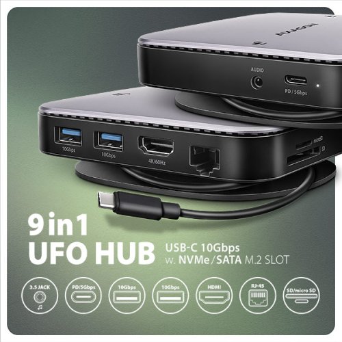 AXAGON HMC-UFO USB-C 10Gbps UFO húb rozšíri Váš notebook, počítač alebo tablet o osem portov a externý box pre M.2 disk . Váš notebook pripojíte k dokovacej stanici 9in1 cez USB-C 65 cm dlhý kábel. V okamihu tak máte k dispozícii integrovaný slot pre NVMe alebo SATA M.2 disk, čítačku SD aj microSD kariet a konektory pre pripojenie monitora , USB zariadenia , slúchadiel , sieťového kábla a Power Delivery napájania . Kompatibilita s Thunderbolt 3/4 vám tiež poskytne jednoduchú a skladnú dokovaciu stanicu k notebooku ako je napríklad Apple MacBook Air alebo Pro . Pre správnu funkciu hubu je nutné, aby USB-C port vášho notebooku podporoval video výstup (DisplayPort Alternate Mode alebo Thunderbolt 3 a vyššie) a Power Delivery napájania. NVME alebo SATA M.2 SSD disk pripojíte vďaka vstavanému slotu na vrchnej strane hubu. Multiport húb sa týmto stáva aj externým diskom. Karty M.2 môžu byť jednostranné alebo obojstranné s rozmermi 22x42, 22x60 a 22x80 mm. Externé M.2 úložisko nemá obmedzenie kapacity SSD diskov, podporuje funkcie TRIM a UASP a umožňuje čítanie SMART . informácií monitorujúcich stav disku. Horný kryt M.2 slotu je vyrobený z hliníka , ktorý zaisťuje optimálnu ochranu a odvod tepla. Vďaka bezskrutkovej montáži je výmena diskov jednoduchá a rýchla. V balení nájdete pasívny chladič , ktorý účinne napomáha zníženiu teploty M.2 diskov. Vďaka prieduchom okolo krytu je zaistená dostatočná cirkulácia vzduchu , čím sa tiež podporuje efektívny odvod tepla . HDMI výstup umožňuje pripojenie externého monitora, TV alebo projektora s rozlíšením až 4K/60Hz Ultra HD, 2K/144Hz Quad HD alebo 1080p/240Hz Full HD a prenos viackanálového zvuku. Vďaka podpore HDR si môžete vychutnať výrazne rozšírený rozsah farieb a kontrastov. Dva USB-A 10Gbps výstupy umožňujú pripojenie externých diskov, flash disku, myši, tlačiarne a ďalšieho USB príslušenstva. USB porty taktiež nabíja mobilné telefóny a tablety výkonom až 7.5W. Hub je tiež vybavený kombinovaným USB-C portom , ktorý môže byť použitý na prenos dát (USB 5Gbps), alebo na nabíjanie notebooku pomocou Power Delivery nabíjačky. S využitím vhodnej PD nabíjačky tak napájate nielen notebook, ale aj samotný húb, s výkonom až 100W vďaka technológii Power Delivery 3.0 . Čítačka pamäťových kariet podporuje čítanie a zápis všetkých verzií SD a microSD kariet s kapacitou až 2TB. Card reader umožňuje súčasnú prácu s kartami v oboch slotoch a priame kopírovanie medzi nimi. Na pripojenie stereo slúchadiel, headsetu alebo aktívnych reproduktorov môžete použiť zvukový výstup 3.5 mm . Ten je vybavený vysoko kvalitným DAC prevodníkom , ktorý podporuje vzorkovanie až 384 kHz pri 24 bitoch . Užijete si tak špičkovú kvalitu zvuku, ktorá je ideálna pre bezstratové formáty ako FLAC, WMA, WAV, APE, AAC alebo ALAC. Gigabitová sieťová karta rozšíri počítač o rýchle a stabilné sieťové pripojenie, doplní chýbajúci sieťový RJ-45 Ethernet konektor , alebo pridá ďalšiu sieťovú kartu. Vďaka premyslenému dizajnu so štyrmi gumovými podložkami na podstavci zostane stanica pevne na svojom mieste. Jednou z najpraktickejších funkcií je uchytenie USB-C kábla , ktorý je elegantne omotaný okolo podstavca . Vďaka tomuto riešeniu si môžete ľahko odvinúť presne takú dĺžku kábla, akú aktuálne potrebujete, čo zamedzuje tomu, aby vám prebytočný kábel zbytočne zaberal miesto na stole . Vďaka funkciám Plug and Play a Hot Plug je samotné zapojenie hubu veľmi jednoduché bez zložitej inštalácie, a taktiež je možné jednoducho pripájať a odpájať periférie za behu počítača. Rozbočovač sa nezľakne ani pripojenie k telefónom s USB-C konektorom. K telefónu tak pripojíte napríklad flash disk, klávesnicu, myš, monitor, TV alebo projektor.