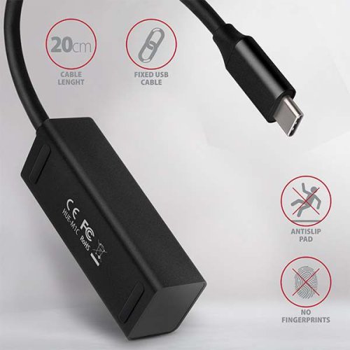 Miniatúrny kovový USB-C 3.2 Gen 1 húb AXAGON HUE-M1C ľahko a rýchlo pripojí k notebooku alebo počítaču až štyri USB zariadenia súčasne. Kovové telo hubu je vyrobené z hliníka a zaisťuje tak dokonalú mechanickú ochranu pre časté prenášanie. Elegantný, jemne štruktúrovaný povrch bráni nežiaducim odtlačkom. Gumové nôžky zabraňujú kĺzaniu hubu po stole. Napevno uchytený USB kábel dĺžky 20 cm je ideálny pre užívateľov mobilných zariadení.
