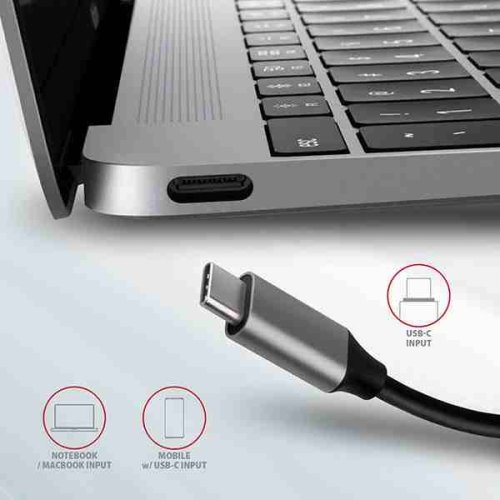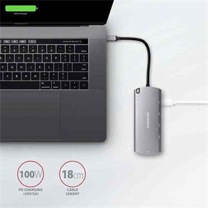 USB-C konektor je vyhradený iba na nabíjanie telefónov alebo notebookov pomocou technológie Power Delivery 3.0 výkonom až 100W. Do hubu zapojíte USB-C Power Delivery nabíjačku a húb pripojíte k notebooku. Tým tiež uvoľníte jeden USB-C port. Podmienkou je notebook s podporou nabíjania z USB-C portu pomocou Power Delivery a vhodná PD nabíjačka.