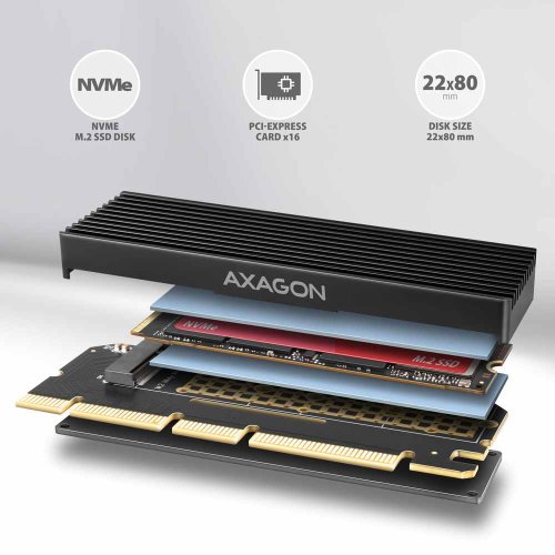 Adaptér podporuje použitie jednostranných aj obojstranných NVMe (PCI-Express) M.2 SSD diskov. Radič nemá obmedzenie kapacity SSD diskov a je možné použiť M.2 karty až do rozmeru 22x80 mm.
