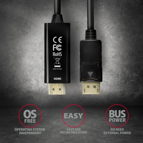 DisplayPort -> HDMI aktívny kábel - redukcia AXAGON RVD-HI14C2 pre pripojenie HDMI monitora/TV/projektora k počítaču s výstupom DisplayPort. Šikovný malý hardvérový prevodník bez potreby akejkoľvek inštalácie či nastavovania zaistí kvalitný prenos obrazu aj zvuku až do rozlíšenia 4K/30Hz . Prenos obrazu a zvuku z počítača alebo notebooku bude teraz hračkou. Kompaktné rozmery zaistia jednoduché použitie aj v miestach s nedostatkom priestoru. Ide o ideálne riešenie - nepotrebujete HDMI kábel a redukciu. S týmto aktívnym káblom je všetko integrované do jedného celku. Kábel je iba jednosmerný, tj prevodník z DisplayPort na HDMI, nie naopak.