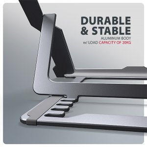 Vlastnosti: • Ľahká a pevná kovová konštrukcia. • Protišmyková úprava, ktorá zároveň chráni zariadenie od poškriabania. • Vhodný pre 10"–17.3" notebooky alebo iné zariadenia. • Osem nastaviteľných pozícií. • Nastaviteľná výška 91–150 mm. • Nosnosť dimenzovaná pre všetky typy notebookov: max. 20 kg. • Skladný a ľahko zložiteľný. • Držiak notebooku umožňuje lepší odvod tepla. • Rozmery: 220 × 230 × 15 mm (Š × H × V). • Hmotnosť: 312 g.