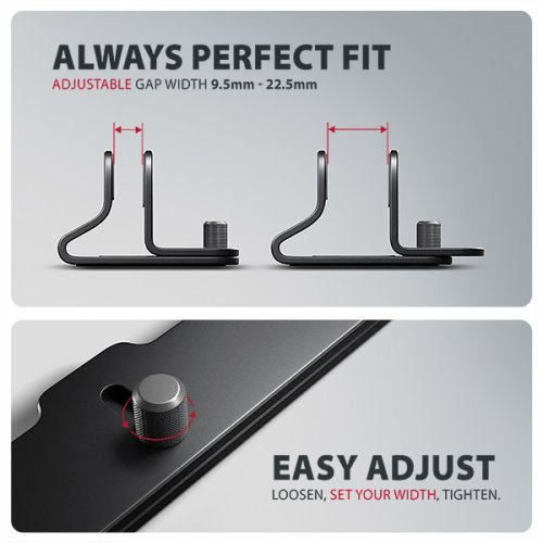Vlastnosti: • Ľahká a pevná kovová konštrukcia. • Protišmyková úprava, ktorá zároveň chráni zariadenie od poškriabania. • Vhodný pre 10"–17.3" notebooky alebo iné zariadenia. • Nastaviteľná šírka 9.5–25.5 mm. • Kompaktné rozmery. • Držiak notebooku umožňuje lepší odvod tepla. • Rozmery: 150 × 50 × 80 mm (Š × H × V). • Hmotnosť: 177 g.
