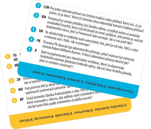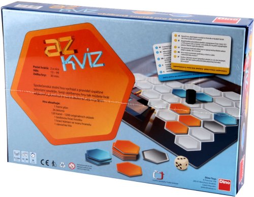 Hra AZ kvíz. Balenie obsahuje 1 herný plán, 36 žetónov, 120 obojstranných kariet s otázkami, 1 bodovú hraciu kocku, 1 hrací kameň a 1 pravidlá. Hra je určená pre 2 a viac hráčov. Vhodné od 13 rokov.