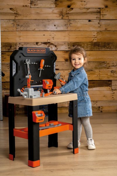 Realistické centrum pracovného stola Smoby Black+Decker so 78 dielmi príslušenstva a 7 nástrojmi. Veľký, robustný pracovný stôl vyzerá ako skutočný otcov pracovný stôl. Veľká pracovná plocha v drevenom designe ponúka dostatok priestoru pre rôzne náradie. Vybavenie je doplnené skrutkovou svorkou a posuvným pravítkom. Veľa úložných priehradok na skrutky a klince. So zábavnou zatĺkacou funkciou klincov. Tento výrobok obsahuje minimálne 75 % recyklovaného materiálu. Rozmery produktu (DxŠxV): 36 x 57,5 x 88 cm.