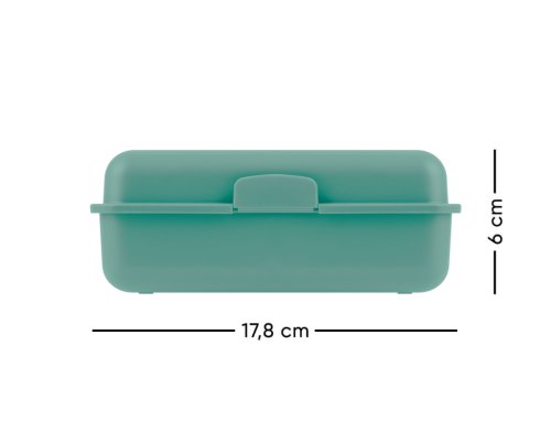 • Plastový box na desiatu. • Box má uzatváranie na jeden zámok a obsahuje deliacu prepážku. • Neodporúčame umývať v umývačke.