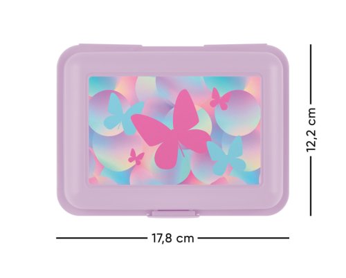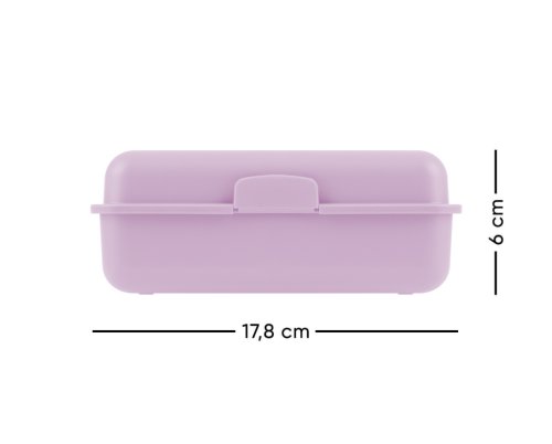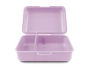 • Plastový box na desiatu vo fialovej farbe. • Box má uzatváranie na jeden zámok a obsahuje deliacu prepážku. • Neodporúčame umývať v umývačke.