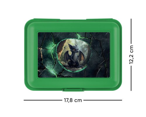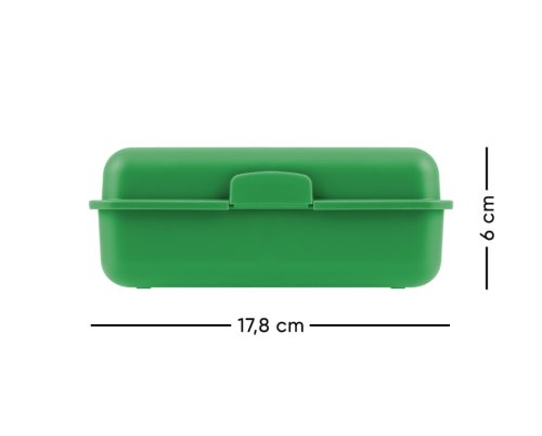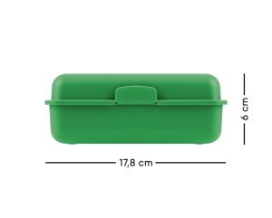 • Plastový box na desiatu v zelenej farbe. • Box má uzatváranie na jeden zámok a obsahuje deliacu prepážku. • Neodporúčame umývať v umývačke.