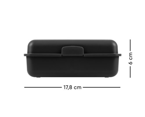 • Plastový box na desiatu v čiernej farbe. <br><br> • Box má uzatváranie na jeden zámok a deliacu prepážku. <br><br> • Neodporúčame umývať v umývačke.