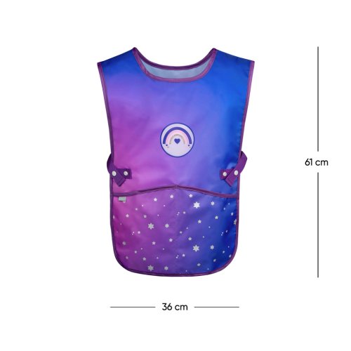 • Detská zástera na výtvarnú výchovu, pracovné činnosti a ďalšie krúžky. • V dolnej časti zástery sú dve vrecká. • Vyrobené z umývateľného materiálu.