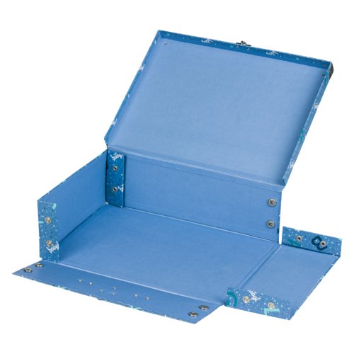 • Skladací kufrík z pevného laminovaného papiera s okovanými rohmi.