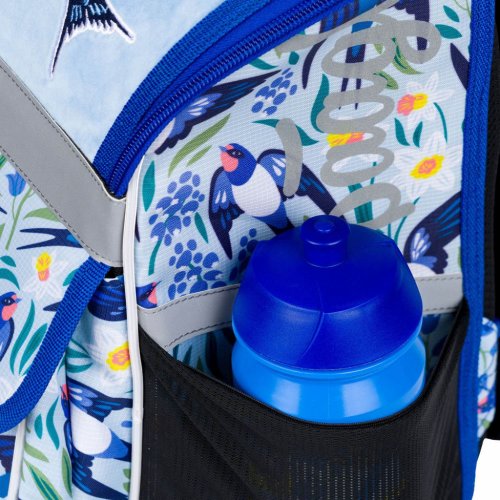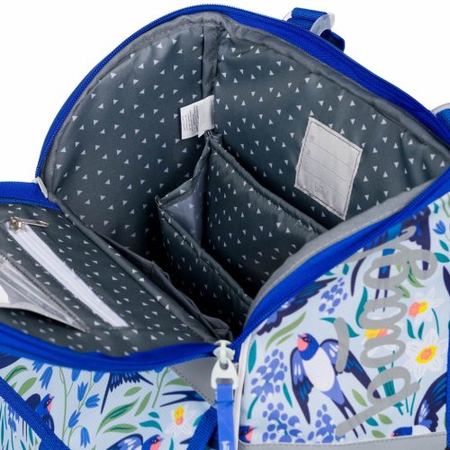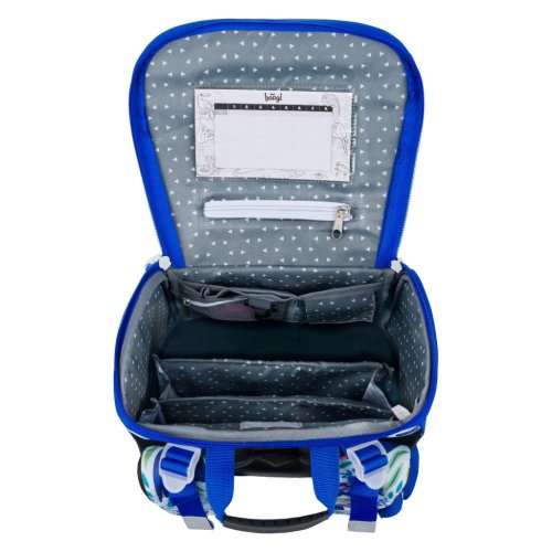 • Vnútri aktovky je priehľadné vrecko s rozvrhom a vnútorný organizér umožňujúci rovnomerné rozloženie hmotnosti, doplnený gumičkou na fixáciu.