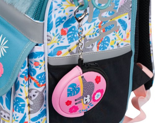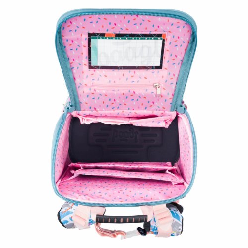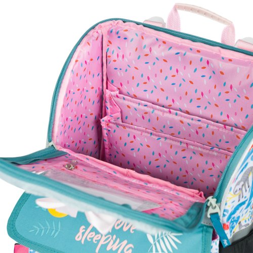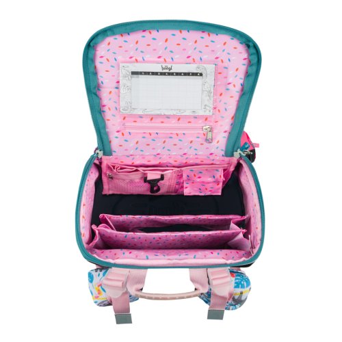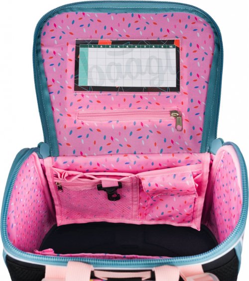 • Vnútri aktovky je priehľadné vrecko s rozvrhom a vnútorný organizér umožňujúci rovnomerné rozloženie hmotnosti, doplnený gumičkou na fixáciu.