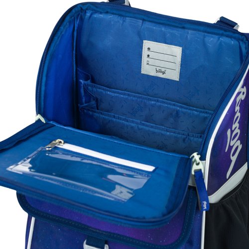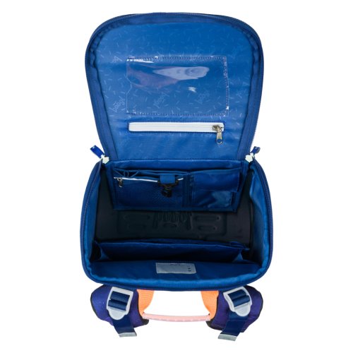 • Vnútri aktovky je priehľadné vrecko na rozvrh a vnútorný organizér umožňujúci rovnomerné rozloženie hmotnosti, doplnený gumičkou na fixáciu.